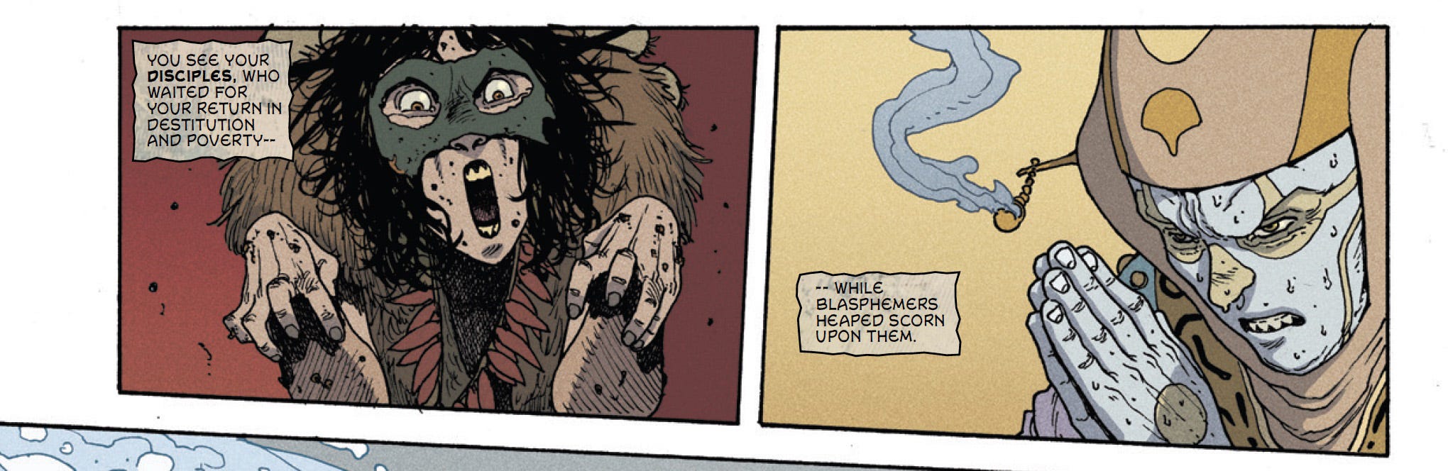 Tomorrow will see the release of our latest story from [MAPS], making this another three-comic week, including the Sunday [SERIAL], ACADEMY. We advise you to buckle up and maybe strap on a helmet to prepare yourselves for SANKTA URBO, drawn by André Lima Araújo and colored by Chris O’Halloran. This story explores the Holy City of Akva via a brutal conflict between the gold priests and the filth priests. It’s violent, it’s filthy, and it’s glorious.