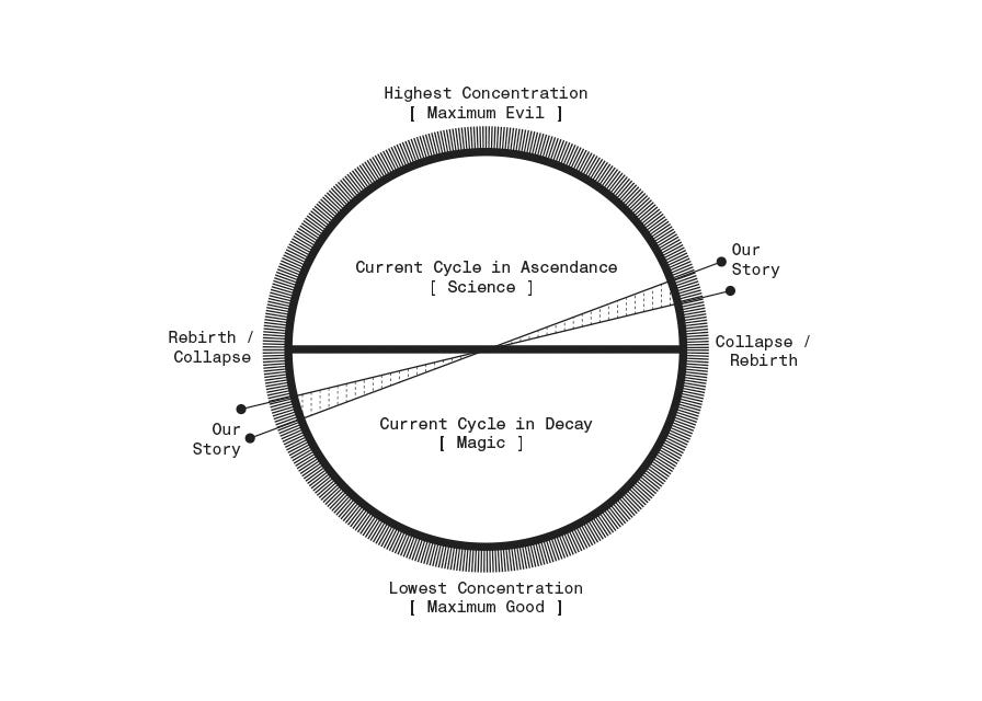 Our story take place in last century of the ‘science’ cycle of an alien solar system. Cycles are hundreds (sometimes thousands) of years long and work like this: As an ascendent cycle approaches its apex, it reaches maximum acceptance as an ideology/belief system and is therefore susceptible to excess and corruption -- and so, it becomes the most ‘evil’ version of that system. Contrary to that, when cycle reaches its lowest point, it is at its most rare -- and idolized -- form and is the most ‘good’ version of that system. There are both ‘good’ and ‘evil’ actors for both systems at all times, but the proportions of each tend to reflect the overall current corruption of each system.